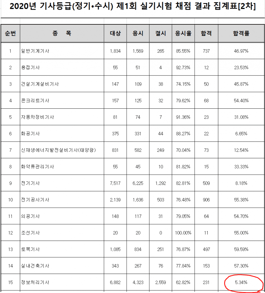 수치만 보면 컴공대생들도 대다수 떨어졌다는 건데, 기출 문제만 계속 돌리던 자격증이 싹 개편되면서 문제은행 자체가 사라짐에 따라 박살난 것으로 보여지네요ㅜㅜ