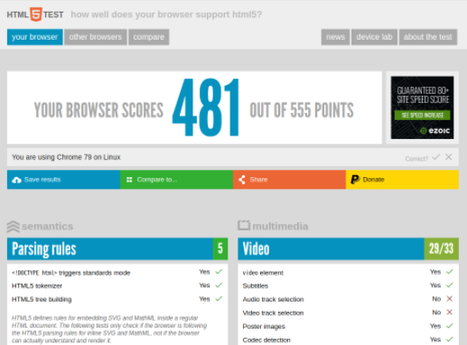 위 사이트를 통해 현재 브라우저의 HTML5 지원 정도를 기능별로 세부적인 확인이 가능하다.
